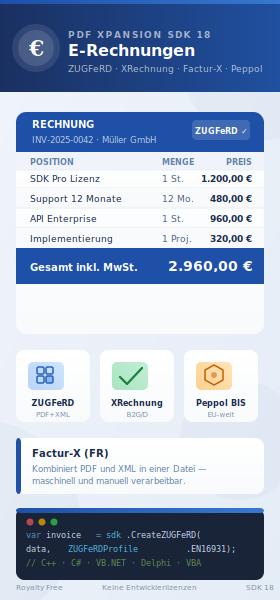 Das PDF Xpansion SDK unterstützt die deutschen E-Rechnungsstandards XRechnung und ZUGFeRD, das französische Factur-X sowie den europaweiten Standard Peppol BIS Billing. XRechnung ist der offizielle Standard für elektronische Rechnungen an öffentliche Auftraggeber in Deutschland. ZUGFeRD kombiniert PDF- und XML-Daten in einer Rechnung, wodurch sowohl maschinelle als auch manuelle Verarbeitung möglich ist. E-Rechnung im SDK