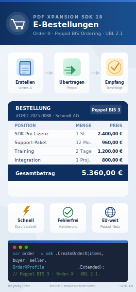 Peppol BIS Ordering und Order-X helfen dabei, den gesamten Bestellprozess effizienter zu gestalten, Fehler zu minimieren und die Transparenz in der Lieferkette zu erhöhen. Unternehmen profitieren von schnelleren Durchlaufzeiten und einer verbesserten Nachverfolgbarkeit von Bestellungen. Mithilfe des SDKs kann diese Funktionalität in Ihre Software eingebunden werden. E-Bestellung im SDK