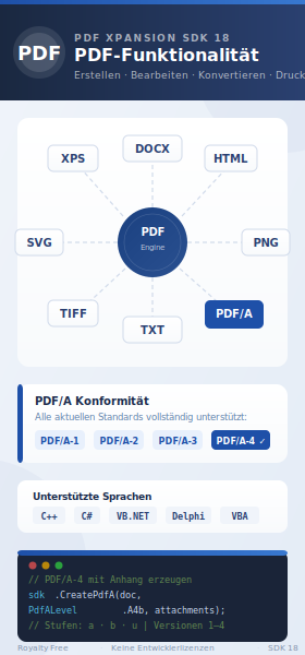 Das PDF Entwickler-Tool stellt mächtige APIs zur Verfügung, mit deren Hilfe Sie PDF-/XPS-fähige Anwendungen und/oder Software-Lösungen entwickeln können. Es bietet Ihnen unter anderem breite Möglichkeiten zur Erstellung und Bearbeitung von PDF-, PDF/A- oder XPS-Dokumenten, für ihre Anzeige in einem multifunktionalen Viewer und den Druck auf Papier, für die Umwandlung zwischen diesen Formaten, entsprechend Export und/oder Import aus/in andere Dateiformaten. Mit dieser API können Sie problemlos PDF-Funktionen sowohl in Desktop-Anwendungen und Serverdienste für Windows als auch in Erweiterungen für MS Office integrieren. Mit der Entwicklerbibliothek können Sie in Ihre Anwendungen Funktionen zum Erstellen von PDF/A-1-, PDF/A-2-, PDF/A-3- und PDF/A-4-Dateien integrieren. Dabei werden alle aktuell existierenden Konformitätsstufen (a, b, u) des PDF/A-Formats unterstützt. PDF-Funktionalität im SDK