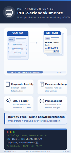 Massenerstellung von PDF-Dokumenten auf Basis von Vorlagen: Mithilfe von Vorlagen können Sie allen generierten PDF-Dokumenten (Briefkopf, Kopfzeile, Fußzeile usw.) eine Corporate Identity zuweisen und Kundendaten in der Vorlage ersetzen, um personalisierte Dokumente zu erstellen. Vorlagen können sowohl mit der SDK-API als auch mit dem interaktiven Editor Perfect PDF 12 erstellt werden. Perfect Print im SDKNamenhafte Unternehmen setzen auf die PDF Xpansion-Technologie