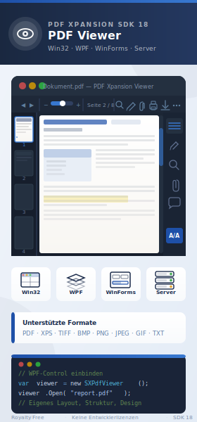 Das SDK bietet für mehrere Entwicklungsplattformen einen PDF Viewer. Mit diesen plattformbezogenen Implementierungsmöglichkeiten können Sie einfach und schnell einen Viewer für PDF-, XPS-, Text- und Bilddateien in Ihre Anwendung einfügen. Zudem können Sie PDF-Dokumente mithilfe der Implementierungsarten in Ihrer eigenen Struktur und eigenem Layout anzeigen. PDF Viewer im SDK