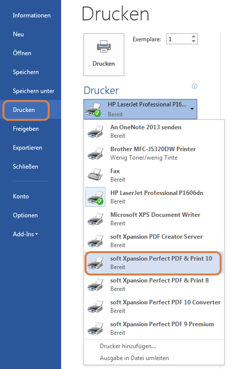 Durch die Installation des virtuellen Druckers ist es möglich Dateien aus jeder beliebigen Anwendung mit Druckerfunktion in PDF umzuwandeln. Rufen Sie das Programm auf, aus der die PDF-Datei erstellt werden soll, gehen Sie in das Druckermenü (Tastenkombination Strg + p) und wählen den Drucker "soft Xpansion Perfect PDF®" aus.