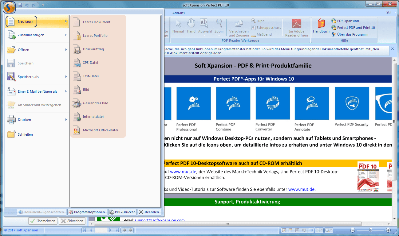 Um aus dem Perfect PDF® Programm heraus ein elektronisches Dokument in das PDF Format zu bringen, öffnen Sie das Hauptmenü (oben links auf das sX-Logo klicken). Im Anschluss wählen Sie "Neu (aus)" und den Dateitypen, welchen Sie umwandeln wollen. Zur Auswahl steht die Umwandlung aus XPS-, TXT-, Bild-, Scanner-, HTML sowie Microsoft-Office Dateien. Navigieren Sie zu dem Ordner in der die gewünschte Datei liegt und klicken auf "OK". Die Datei wird als PDF-Datei in dem Programm angezeigt. Anstelle über das Menü zu gehen, kann die gewünschte Datei auch per Drag & Drop eingefügt werden.